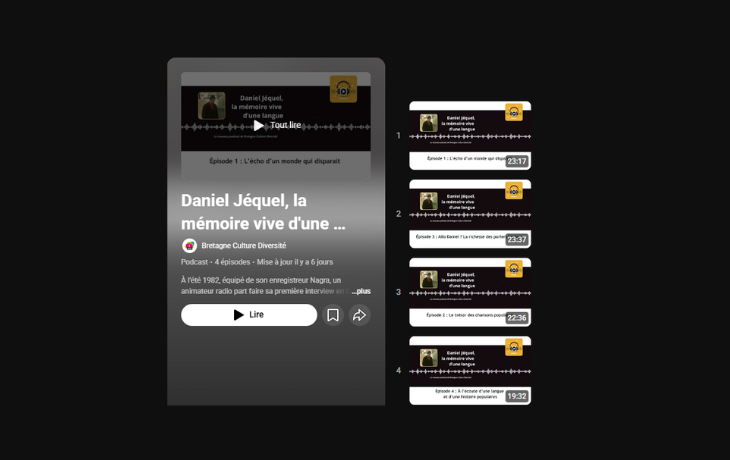 A travers quatre épisodes, les interventions de chercheuses et chercheurs, de Daniel Jéquel et d’autres protagonistes, viennent éclairer ces archives sonores, offrant une lecture sociologique et historique précieuse. Il permet également de faire entendre la diversité des variétés dialectales du breton et d’en apprécier toute la richesse linguistique et culturelle.